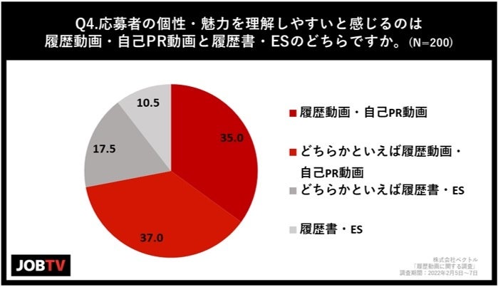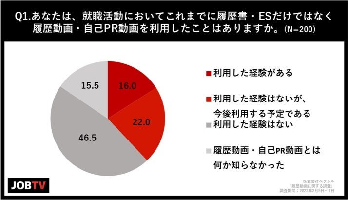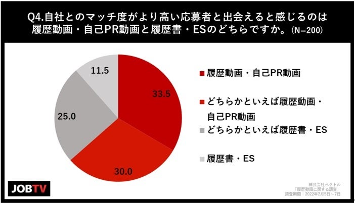 株式会社ベクトル(本社:東京都港区、代表取締役:長谷川創、東証一部:6058、以下ベクトル)は、採用/就職活動の入口を動画で完結することにより、スピーディなマッチングを実現する採用プラットフォーム「JOBTV for新卒」(https://jobtv.jp )にて、200名の就活生および200名の新卒採用業務担当人事を対象に「履歴動画に関する調査」(調査期間:2022年2月5日~7日)を実施しました。
