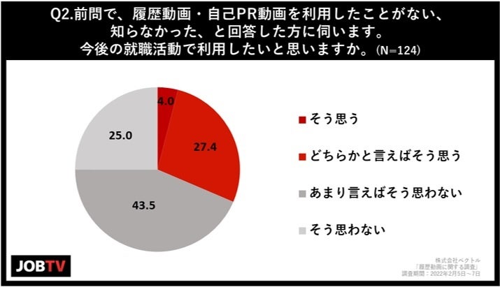 Q2.「前問で、履歴動画・自己PR動画を「利用したことがない」「知らなかった」と回答した方に伺います。 今後の就職活動で利用したいと思いますか。(n=124)」と質問したところ、4.0%が「そう思う」、27.4%が「どちらかと言えばそう思う」と回答しました。