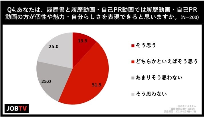 Q4.「あなたは、履歴書と履歴動画・自己PR動画では履歴動画・自己PR動画の方が個性や魅力・自分らしさを表現できると思いますか。 (n=200)」と質問したところ、13.5%が「そう思う」、51.5%が「どちらかと言えばそう思う」と回答しました。
