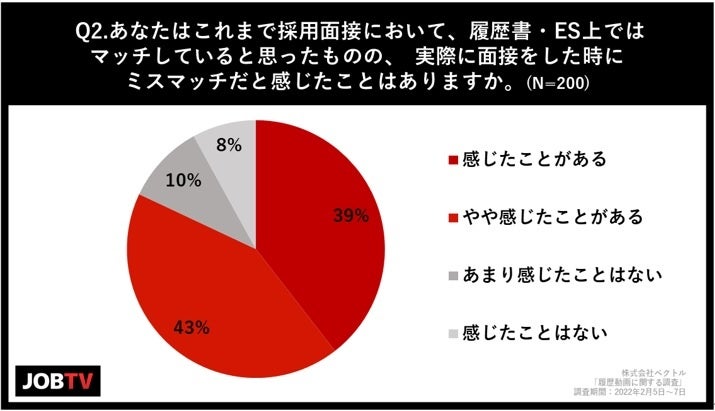 Q2.「あなたはこれまで採用面接において、履歴書・ES上ではマッチしていると思ったものの、 実際に面接をした時にミスマッチだと感じたことはありますか。(n=200)」と質問したところ、39.5%が「感じたことがある」、42.5%が「やや感じたことがある」と回答しました。