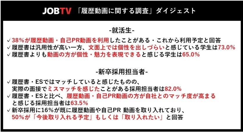 今回の調査結果を踏まえ、「JOBTV for新卒」は今後も就活生/企業双方の課題や悩みに寄り添い、解決の一助となるような機能及びサービスを追加することにより、円滑な就職/採用活動をサポートしてまいります。