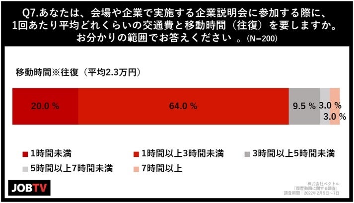 Q7.「あなたは、会場や企業で実施する企業説明会に参加する際に、 1回あたり平均どれくらいの交通費と移動時間(往復)を要しますか。 お分かりの範囲でお答えください。(n=200)」と質問したところ、が「1時間未満」、が「1時間以上3時間未満」、が「3時間以上5時間未満」、が「5時間以上7時間未満7時間以上」と回答し、平均は2.3時間という結果になりました。