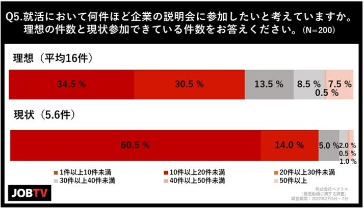 参加したい企業説明会の理想の件数と現状参加した件数では約10件のギャップがあることが判明!