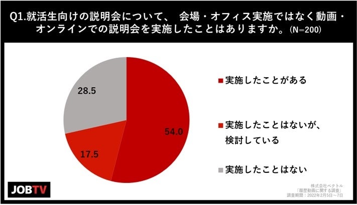 Q1.「あなたの企業では、就活生向けの説明会について、 会場・オフィス実施ではなく動画・オンラインでの説明会を実施したことはありますか。(n=200)」と質問したところ、54.0%が「実施したことがある」、17.5%が「実施したことはないが、検討している」と回答しました。