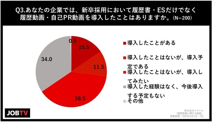 Q3.「あなたの企業では、新卒採用において履歴書・ESだけでなく履歴動画・自己PR動画を導入したことはありますか。(n=200)」と質問したところ、15.5%が「導入したことがある」、11.5%が「導入したことはないが、導入予定である」と回答しました。また、38.5%が「導入したことはないが、導入してみたい」と回答。これは未導入企業の53%が今後の導入意向があると言えます。