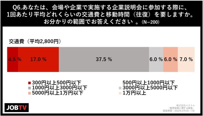 Q6.「あなたは、会場や企業で実施する企業説明会に参加する際に、 1回あたり平均どれくらいの交通費と移動時間(往復)を要しますか。 お分かりの範囲でお答えください。(n=200)」と質問したところ、4.5%が「300円以上500円以下」、17.0%が「500円以上1000円以下」、37.5%が「1000円以上3000円以下」、6.0%が「3000円以上5000円以下」、6.0%が「5000円以上1万円以下」、7.0%が「1万円以上」と回答し、平均は平均2,800円(小数点以下四捨五入)という結果になりました。