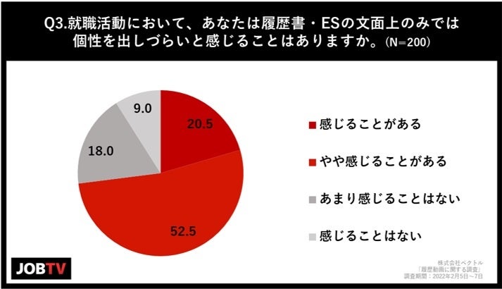 Q3.「就職活動において、あなたは履歴書・ESの文面上のみでは個性を出しづらいと感じることはありますか。(n=200)」と質問したところ、20.5%が「感じることがある」、52.5%が「やや感じることがある」と回答しました。