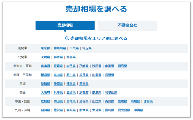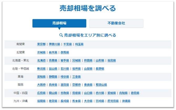 「ズバット 不動産売却」トップページの最下部にある「売却相場を調べる」より、確認したい都道府県をクリックし、遷移したページにて各種コンテンツが閲覧できます。