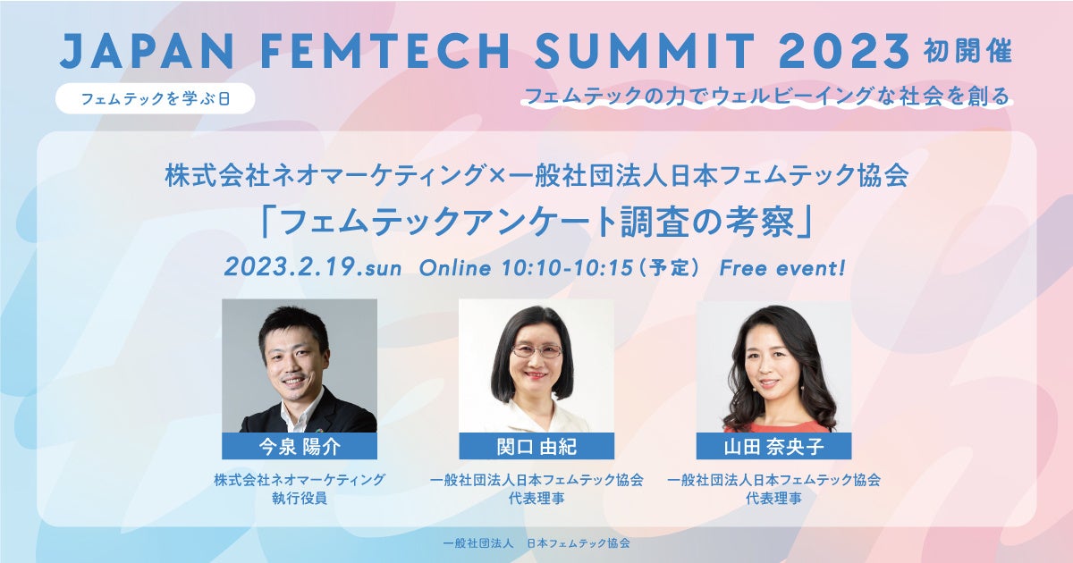 生活者起点のリサーチ&マーケティング支援を行なう株式会社ネオマーケティング(所在地:東京都渋谷区、以下ネオマーケティング)は、一般社団法人日本フェムテック協会(所在地:東京都港区)が主催する「第1回 JAPAN FEMTECH SUMMIT 2023」での登壇が決定しましたことをお知らせします。