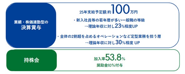 当社は、単なる賃上げではなく、株価を意識した経営を推進しています。2017年から全社員を無期雇用の正社員とし、同一労働同一賃金の実現や、全社員統一の人事制度を導入するなど、社員の挑戦、成長を後押しする仕組みや取り組みを行ってきました。2022年11月25日に発表したプレスリリースでは、全社員を対象にした決算賞与制度の導入を発表しました。この制度は、期初計画を超過した単体経常利益の一定割合の2/3を現金、1/3をファントム・ストックで支給する仕組みを採用し、社員の企業価値(株価)や経営参画に対する意識を高めています。また、決算賞与の導入に加え、社員全員が業績や株価を意識する風土を醸成するため、持株会制度への加入も推進しています。持株会は1,000円からの少額購入が可能で、奨励金10%も付与され、持株会の加入率は53.8%に達しています(2025年3月現在)。これらの業績連動型報酬制度の導入により、業績目標の達成意欲や働くモチベーションの向上につなげています。合わせて、社長の水野により決算賞与額発表のイベント実施や、社内報での情報発信を通して、理解浸透を図ってまいりました。社員の中長期的な資産形成を支援し、時価総額1兆円規模を目指す当社の成長を支える制度となっております。