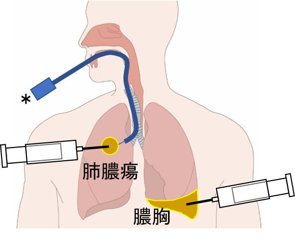 膿胸の検体を経皮的に採取することは容易ですが、肺膿瘍の場合は従来、口から入れた気管支鏡を使ってサンプルを採取する方法が行われてきました(右図の*)。しかしこの方法ではサンプルが口腔の細菌に汚染される可能性があります。私たちは以前から、肺の病巣に対して経皮的に細い針を刺して1回の息止めの間にサンプルを採取するという技術をもっており肺の病気の診断に活用してきました。肺膿瘍の診断にもこの方法を使い口腔細菌の汚染なくサンプルを採取し、正しく原因菌を決定することで適切な抗菌薬の選択を行ってきましたが、この方法が今回、本研究にも大きく寄与しました。