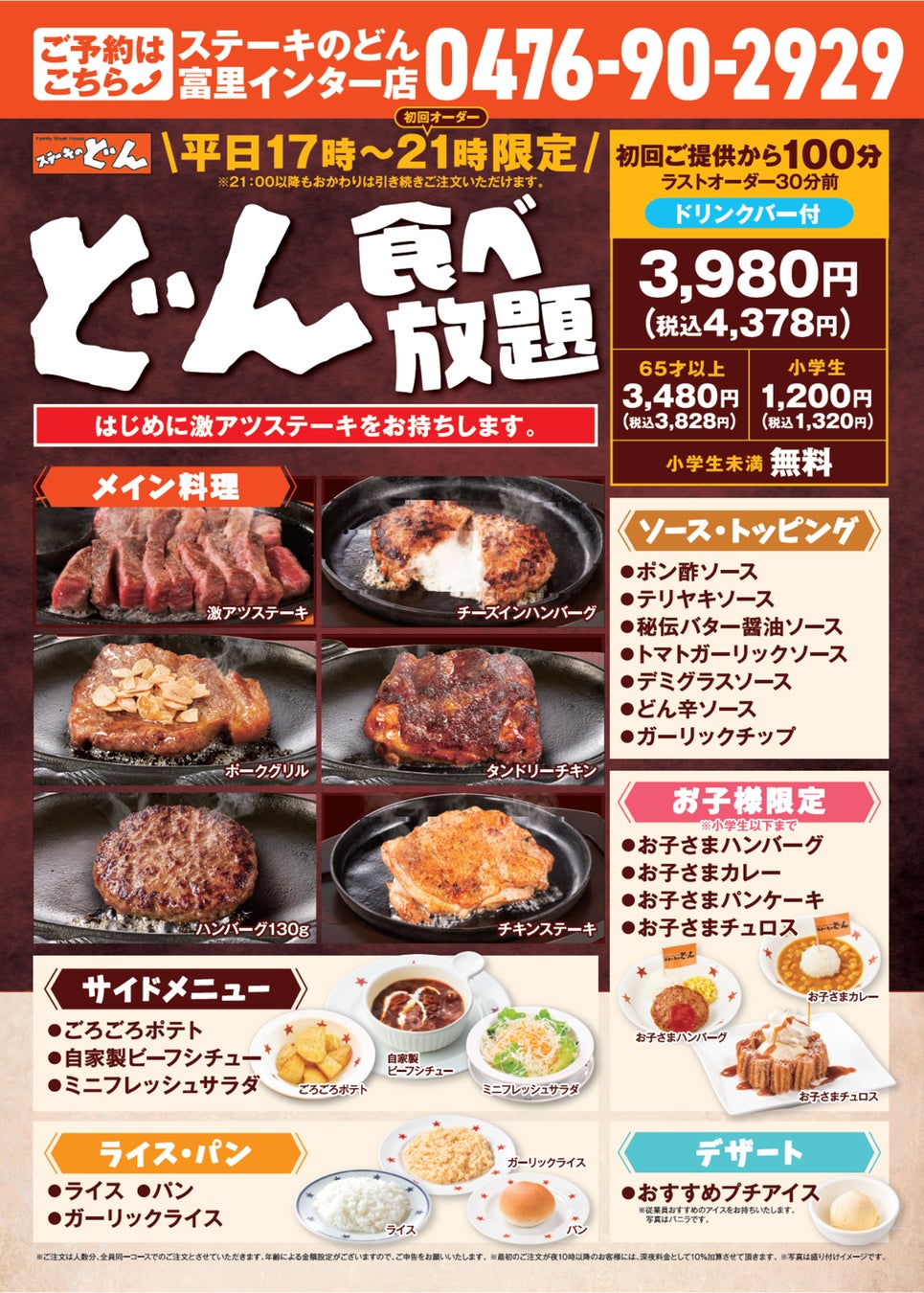 ●「ステーキのどん富里インター店」にお電話で「食べ放題予約」とお伝えください。