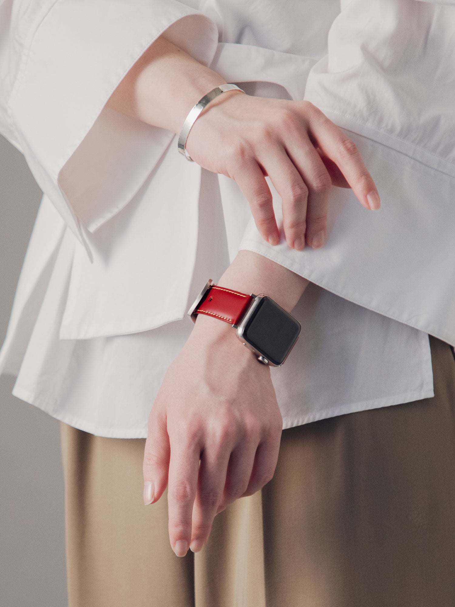 Apple Watch38・40・41mm用と42・44・45mm用の2タイプを展開。長さは男女問わずお使いいただけるよう、9段階で調整可能です。挿し込みながらスライドさせるだけで、簡単に装着・脱着できるようになっています。
