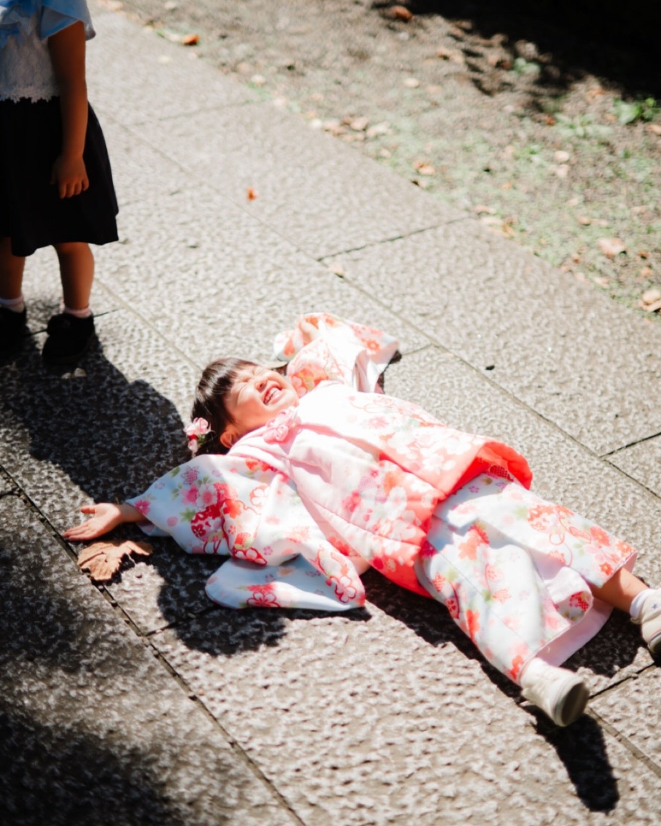 延期して迎えた快晴の七五三日和。着物もヘアセットも完璧で、ご機嫌に神社へ到着しました。 祈祷も撮影も順調に進むと思った瞬間、「あー!気持ちー!!!」と叫んで、地面にゴロン。 日当たりが最高で、気持ちよすぎて寝転んでしまった瞬間の1枚です。