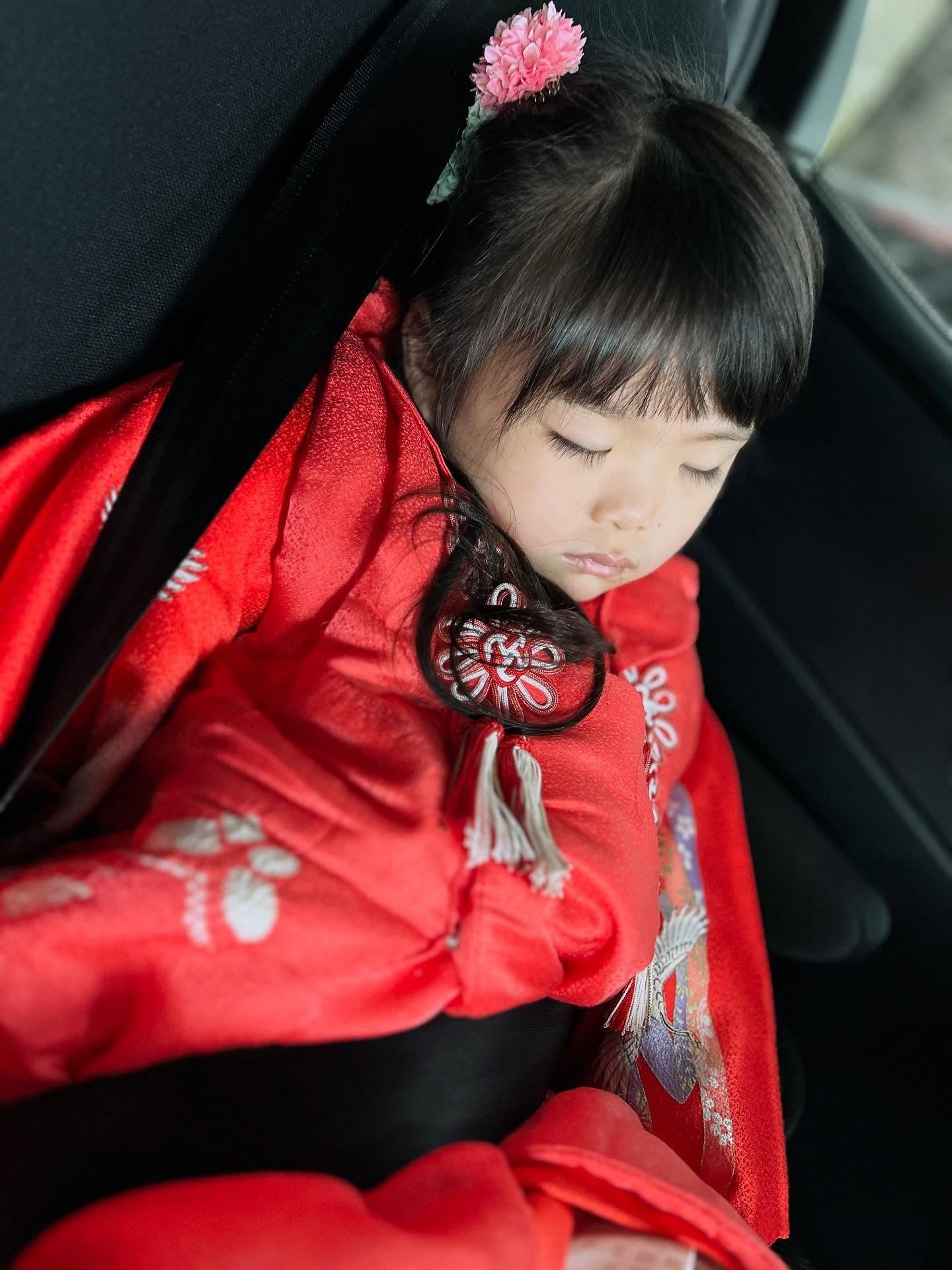 神社に行くまでの車の中で、すやすや眠ってしまった娘