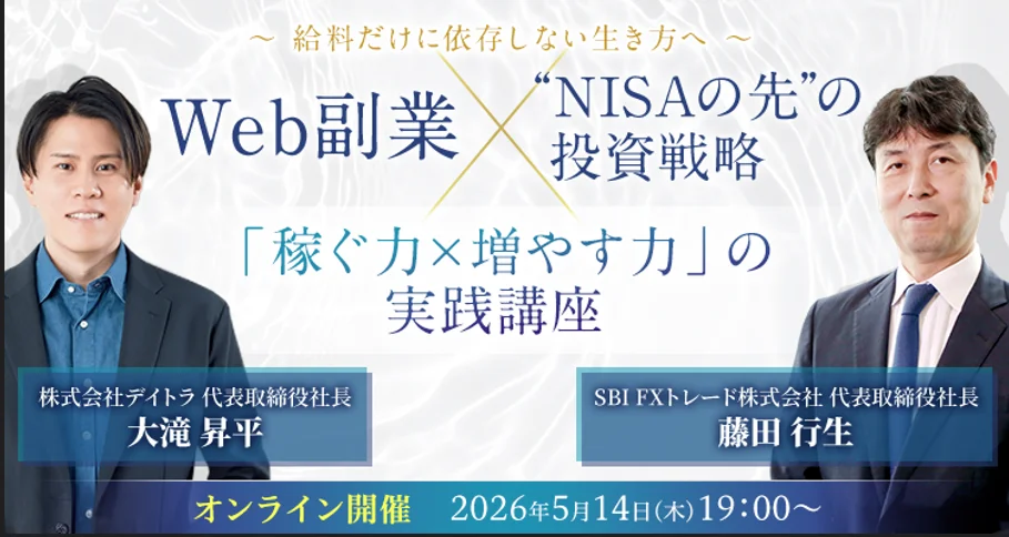SBI FXトレード株式会社(本社:東京都港区、代表取締役社長:藤田行生)と株式会社デイトラは、これからの時代に求められる「働き方」と「資産形成」の両輪をテーマとしたコラボウェビナー「【給料だけに依存しない生き方へ】Web副業×" NISAの先" の投資戦略「稼ぐ力×増やす力」の実践講座」を2026年5月14日(木)19:00〜にオンライン開催いたします。