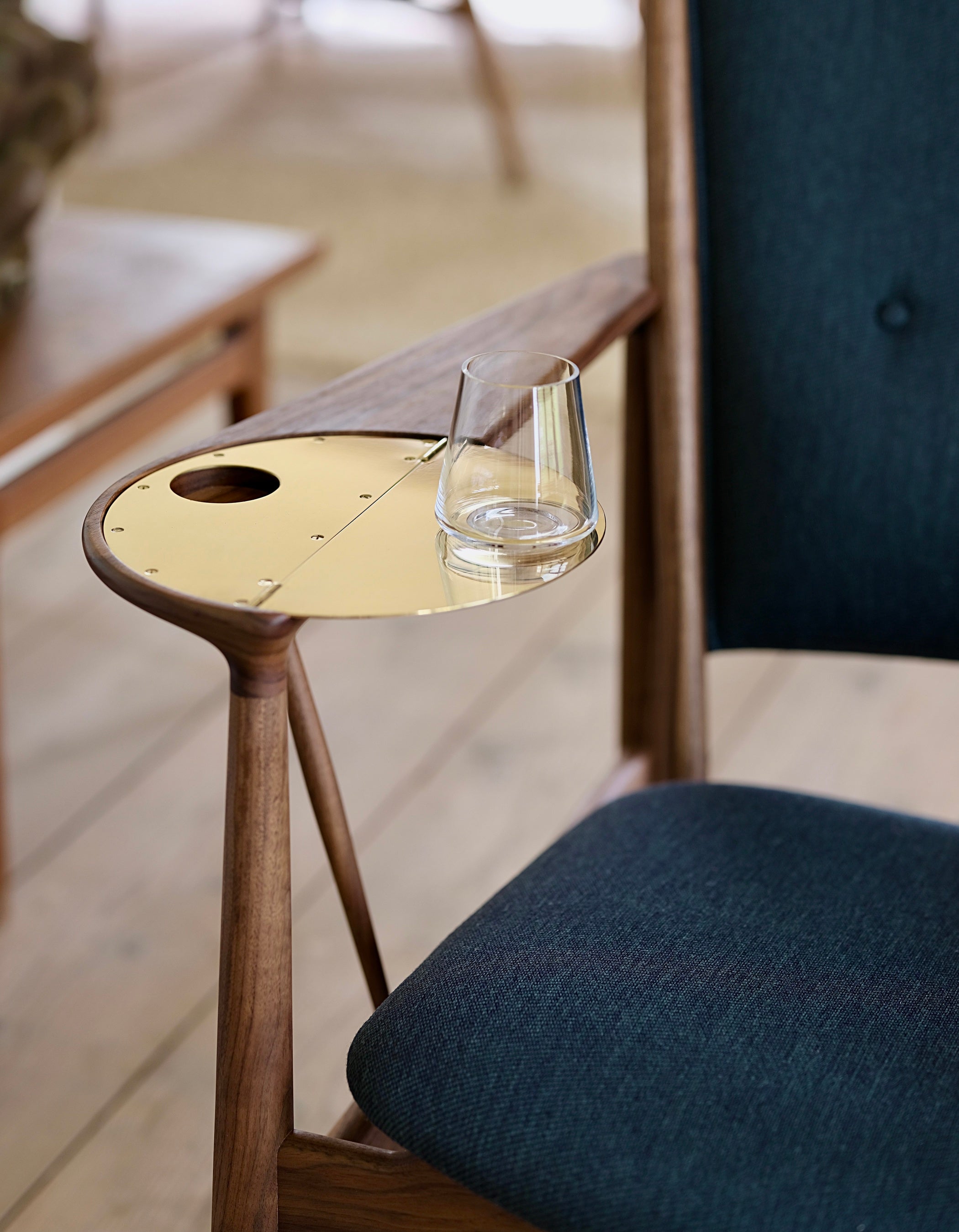この真鍮製トレイの表面にはウィスキーグラスを置くことができるよう形作られ、開いて円形に展開することができます。また、張地はファブリックもしくはレザーからお選びいただけ、熟練の職人が手作業で張り込みを行います。フレームには厳選された最高品質のウォールナット材を採用、さらに脚先も真鍮が施されるなど、全体を通し、挑戦的でありながら遊び心のあるデザインとなっています。