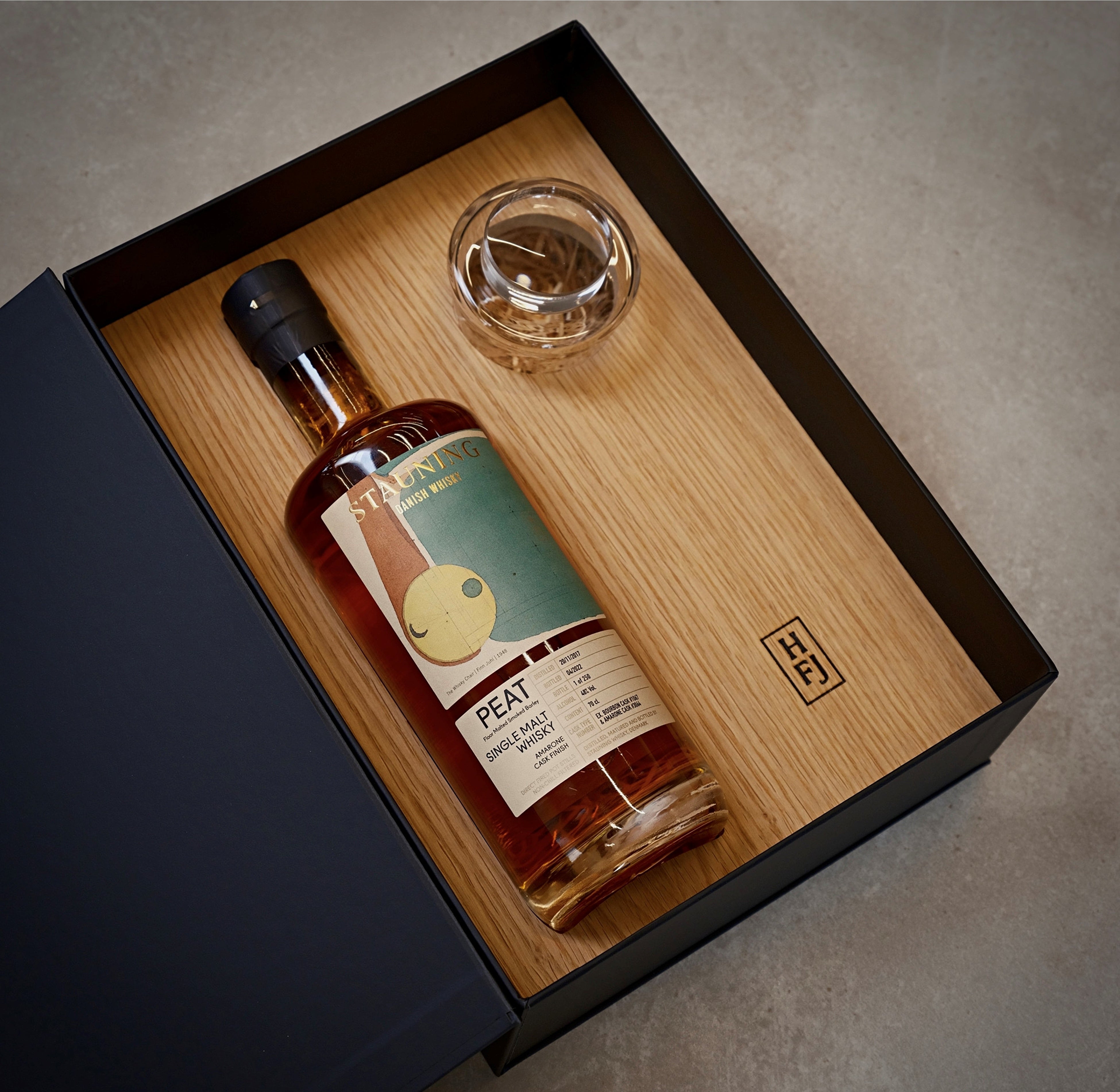 特別にお届けするウイスキーは、受賞歴のあるデンマークの蒸留所Stauning Whiskyによって、アマローネワインキャスクで熟成された、限定ピートスモークシングルモルトウイスキーのボトルです。このウイスキーはWhisky Chairのために特別開発されました。