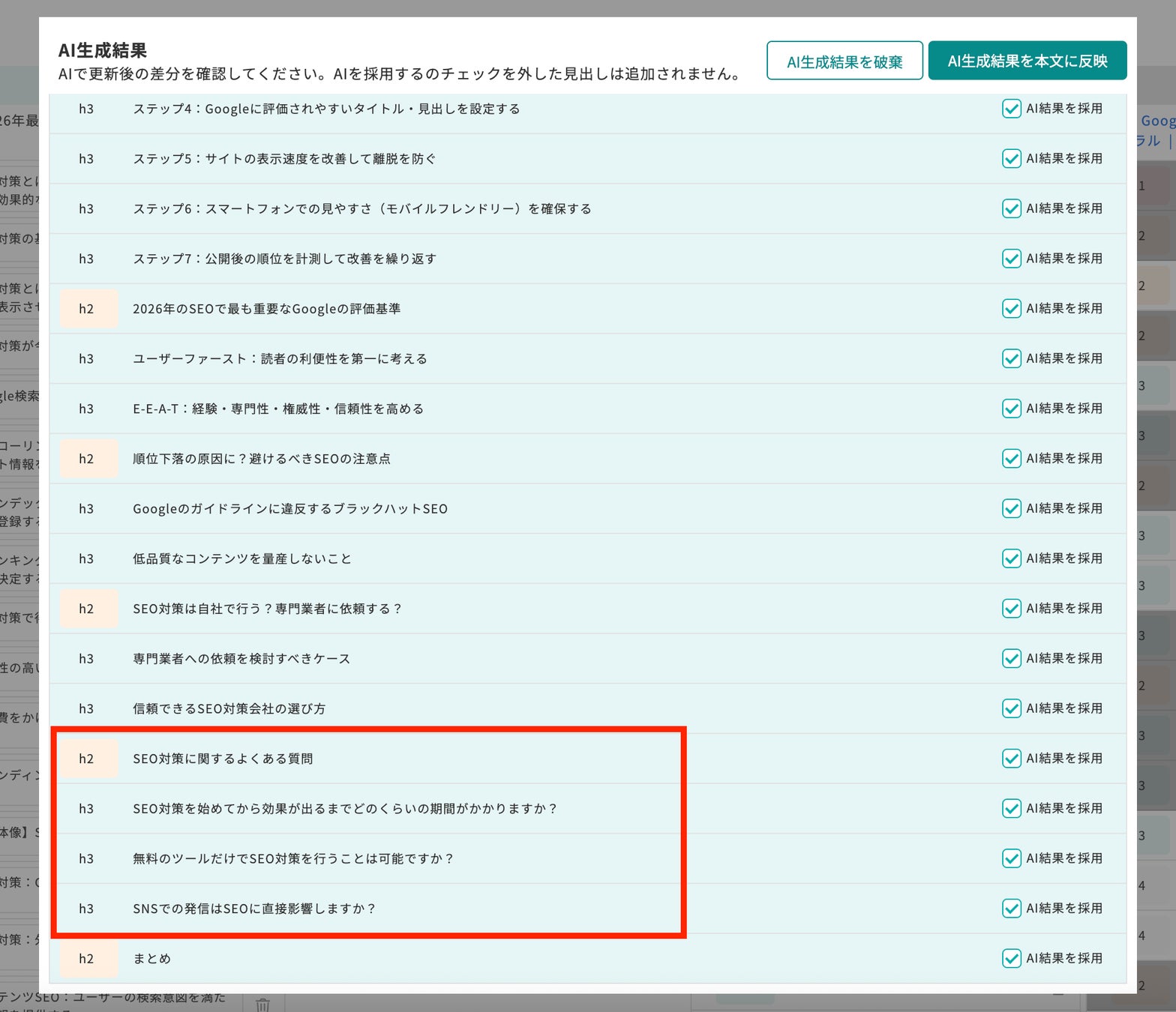 ウィルゲートのCS(カスタマーサクセス)が推奨してきた「FAQや補足情報を含めた記事構成」の知見をAIロジックに反映しました。読者が求める具体的な回答を構成に含めることで、専門性と独自性を高め、Googleの評価基準であるE-E-A-T(経験・専門性・権威性・信頼性)を意識した記事作成が可能になります。