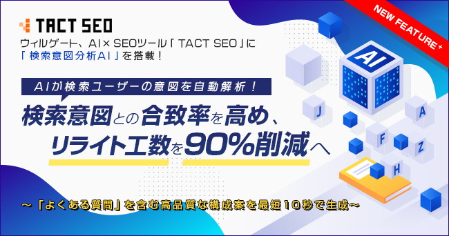 ウィルゲート、AI×SEOツール「TACT SEO」に「検索意図分析AI」を搭載!検索意図との合致率を高め、リライト工数を90%削減へ