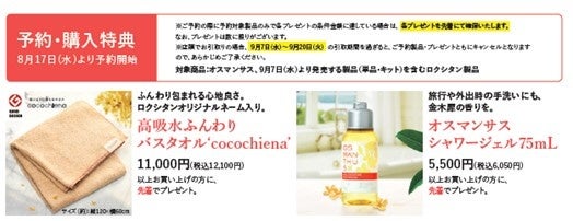 オスマンサス、9月7日(水)発売の製品(単品・キット)を含むロクシタン製品を税込12,100円以上お買い上げの方に「高吸水ふんわりバスタオル」を、税込6,050円以上お買い上げの方には「オスマンサス シャワージェル75mL」を先着でプレゼントいたします。この機会をぜひお見逃しなく。