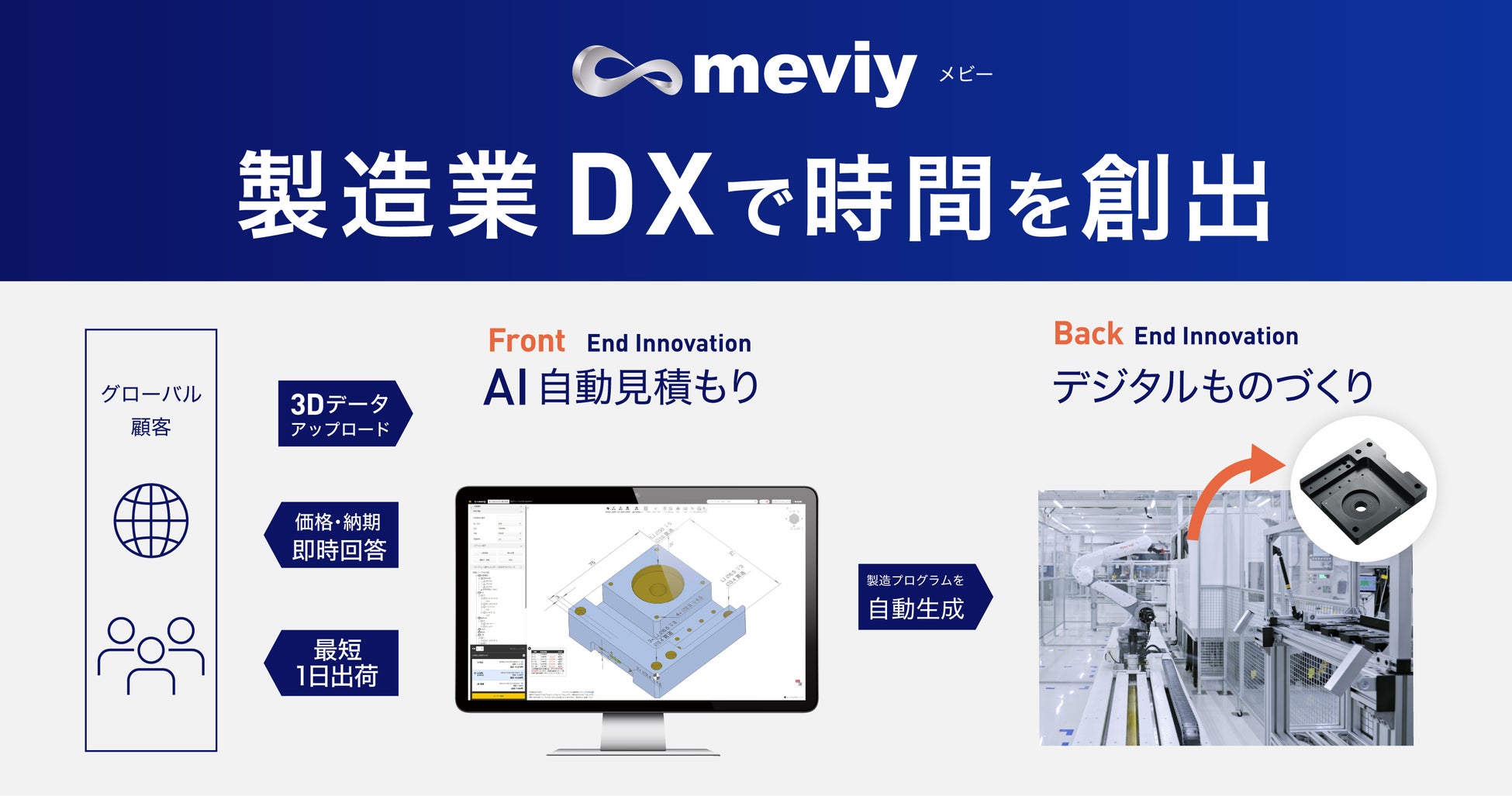 2000年には業界に先駆けてインターネット注文サービスを開始し、部品の選定から発注までをWebで完結させる仕組みを構築しました。そして、3DデータのみでAIが自動見積もりをする「meviy(メビー)」をはじめ、数々の革新的なサービスを展開、産業界の生産性向上に確かな変革をもたらしてきました。