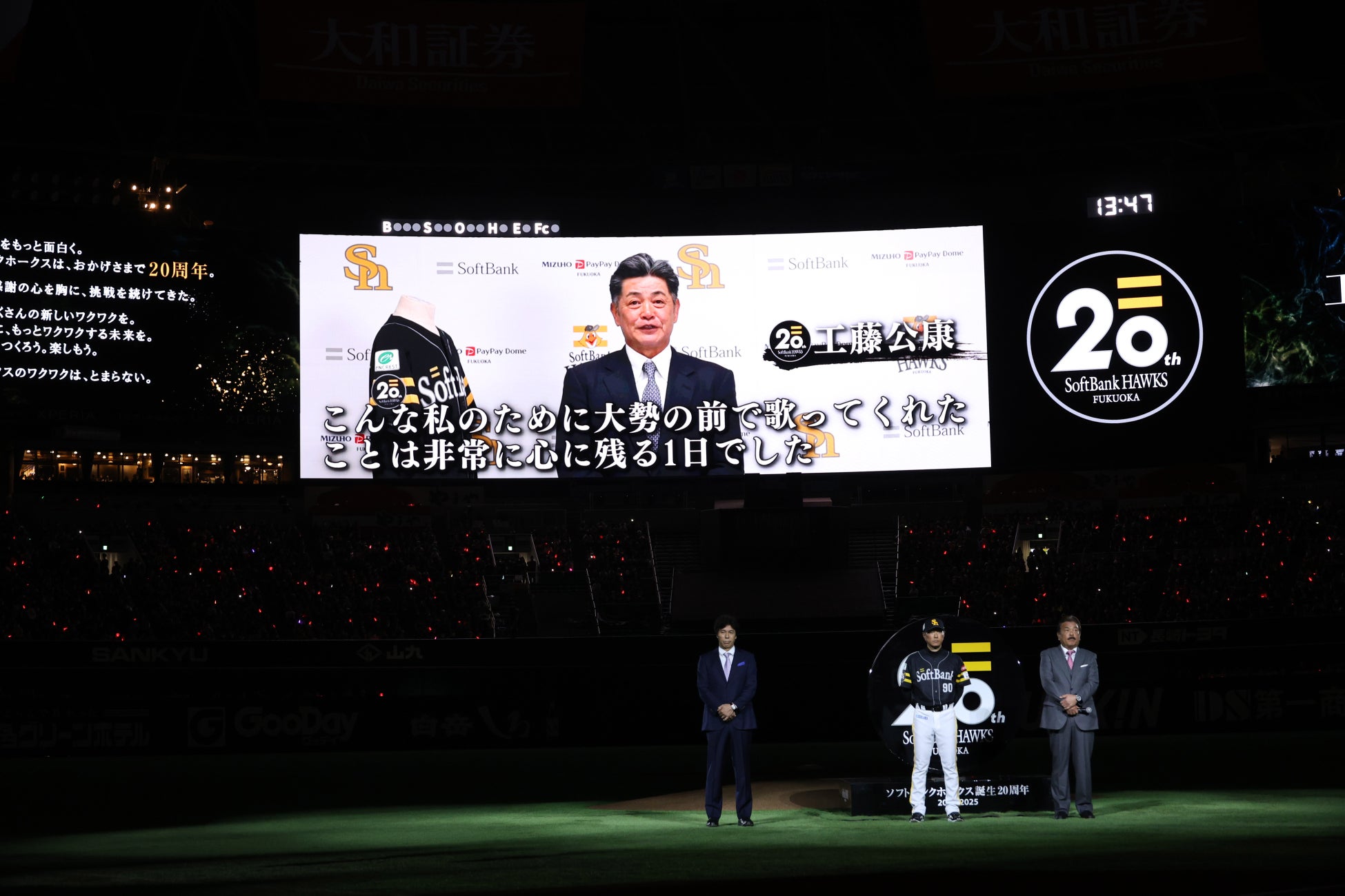 こんにちは、工藤公康です。ソフトバンクホークス20周年を迎え、本当におめでとうございます。私も7年間監督として指導させていただき、大変光栄に思っております。一番の思い出というのは、2016年に大逆転されて2位になった後に、2017年に優勝できたことです。あの時は勝つために何をすればいいかを考えた1年でもありました。
