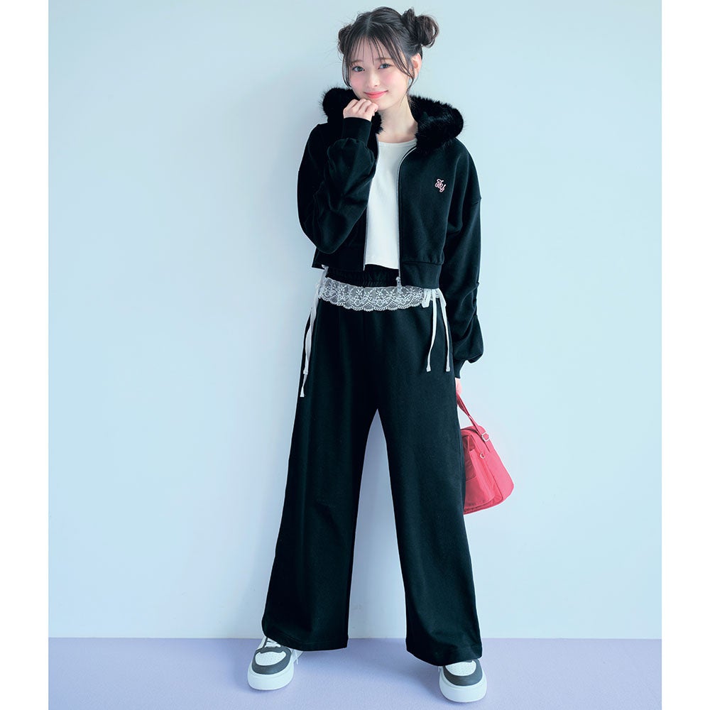 【高比良由菜・ゆなちゃんコラボ】サイドリボンレースデザインコットンスウェットワイドストレートパンツ(ウエスト調節可)【セットアップ可】