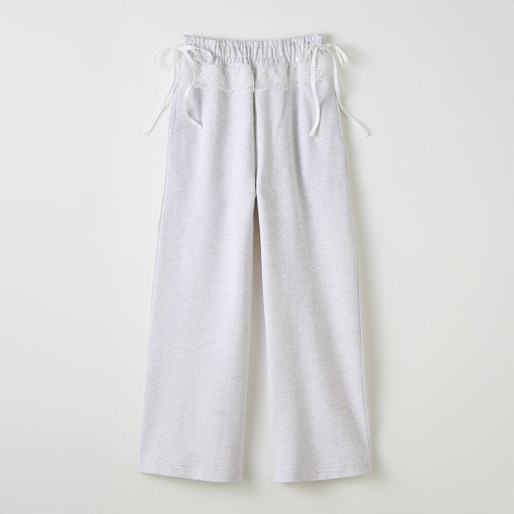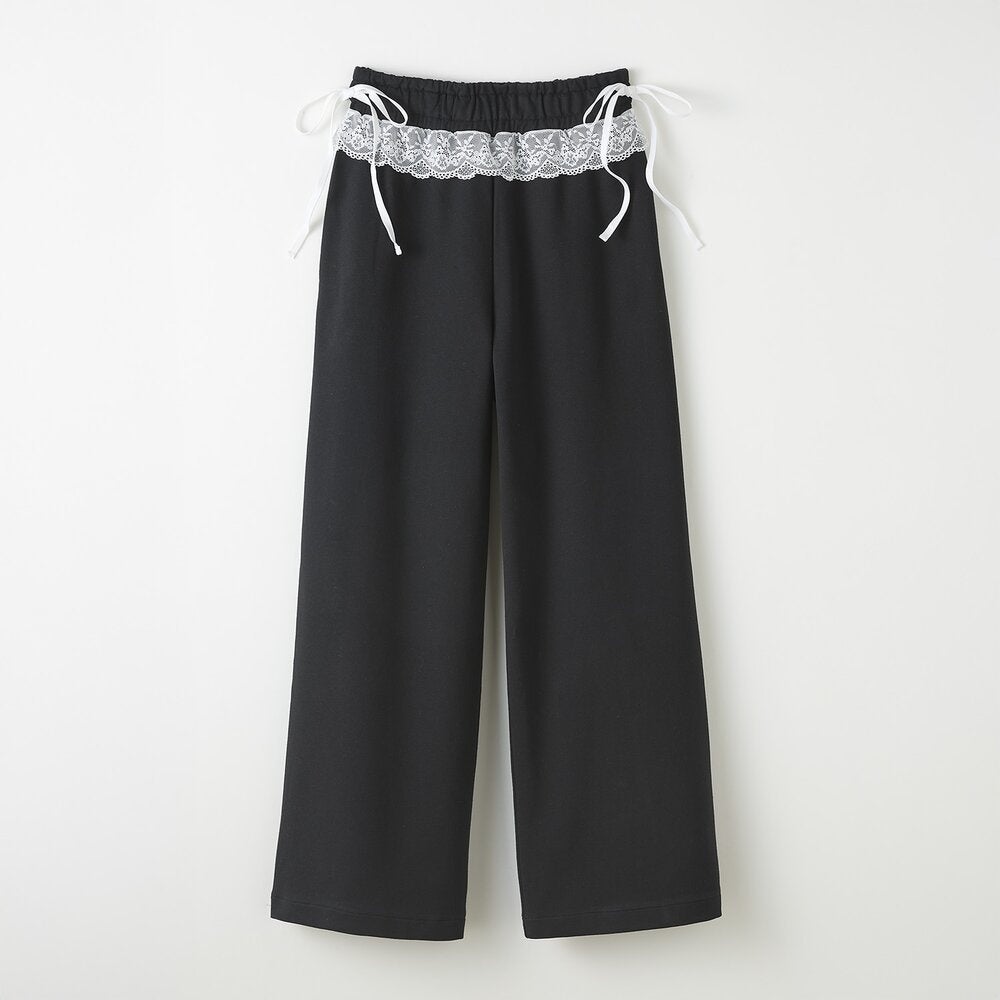 ●サイドリボンレースデザインコットンスウェットワイドストレートパンツ