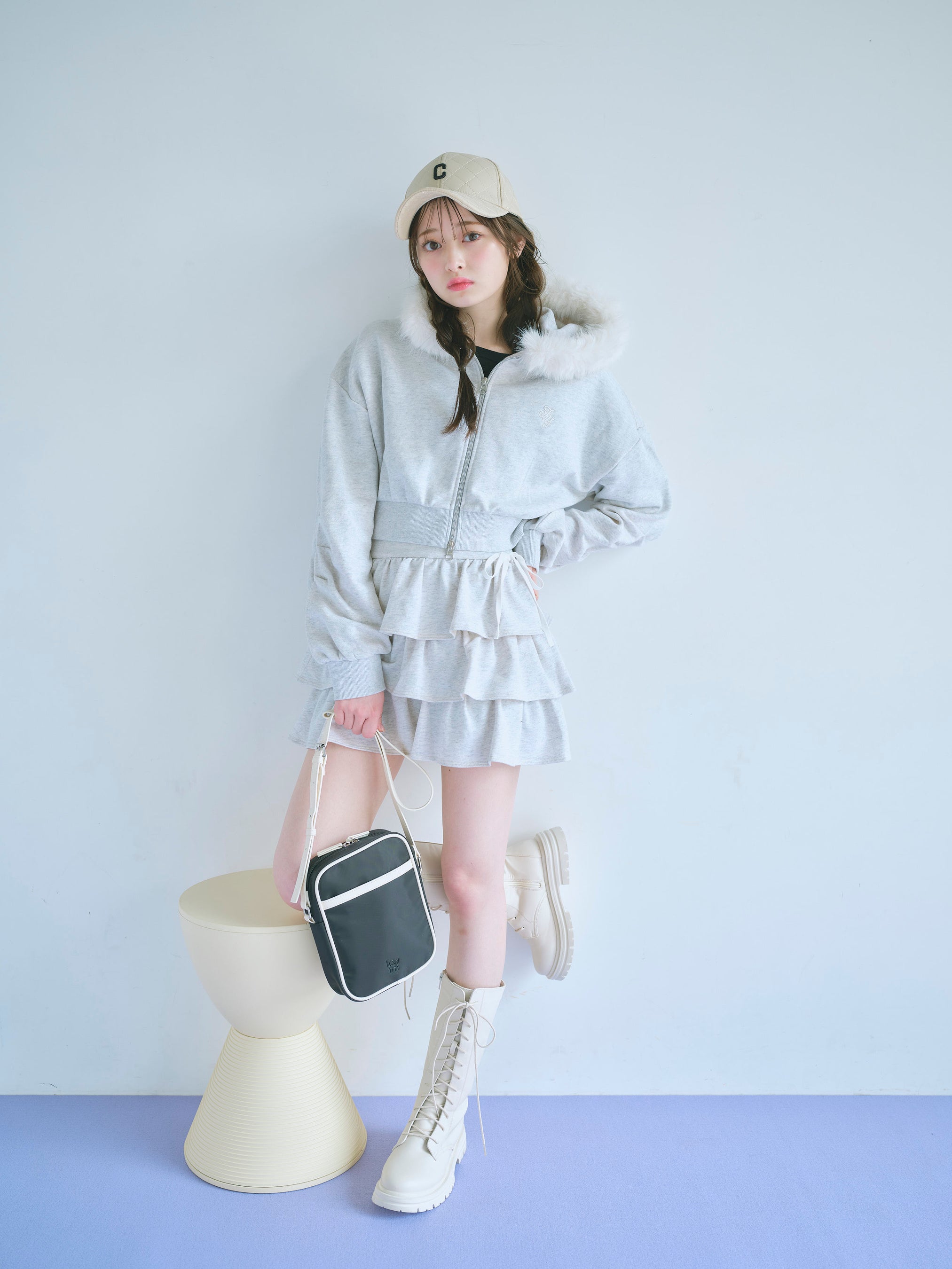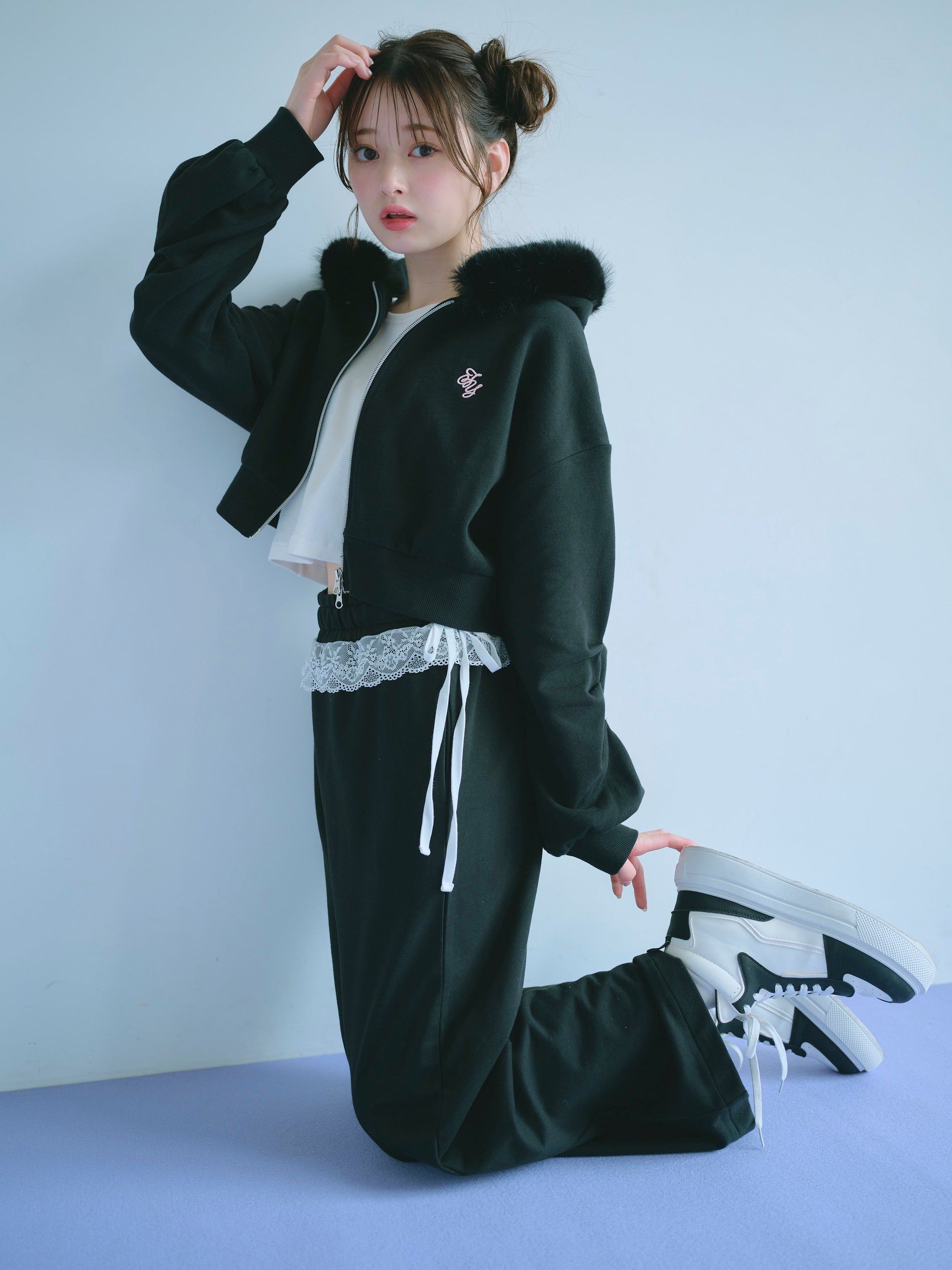 高比良さんが提案するトレンドのスウェット素材のセットアップは、ジップパーカ、ミニスカート、ワイドパンツの3点です。高比良さんが好むレースやリボンといったガーリーな要素を取り入れつつ、スウェット生地を採用したことで、可愛いらしさとカジュアルさを両立しています。