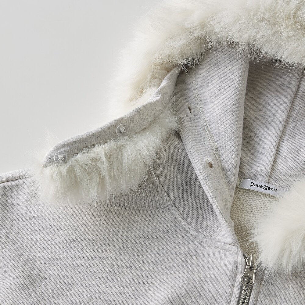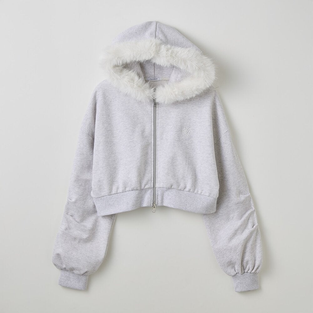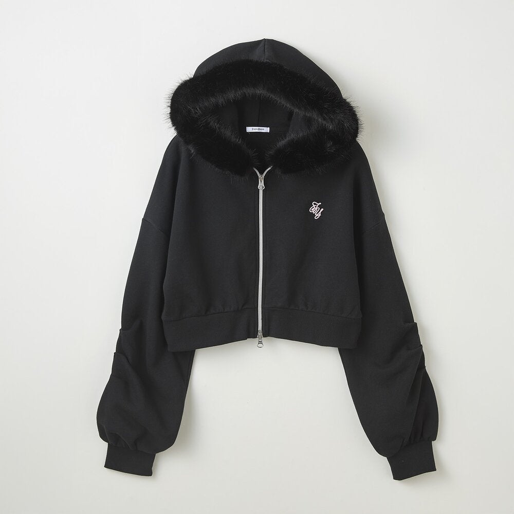 ●取り外しフェイクファー付き袖タックコットンスウェットショート丈ジップパーカ