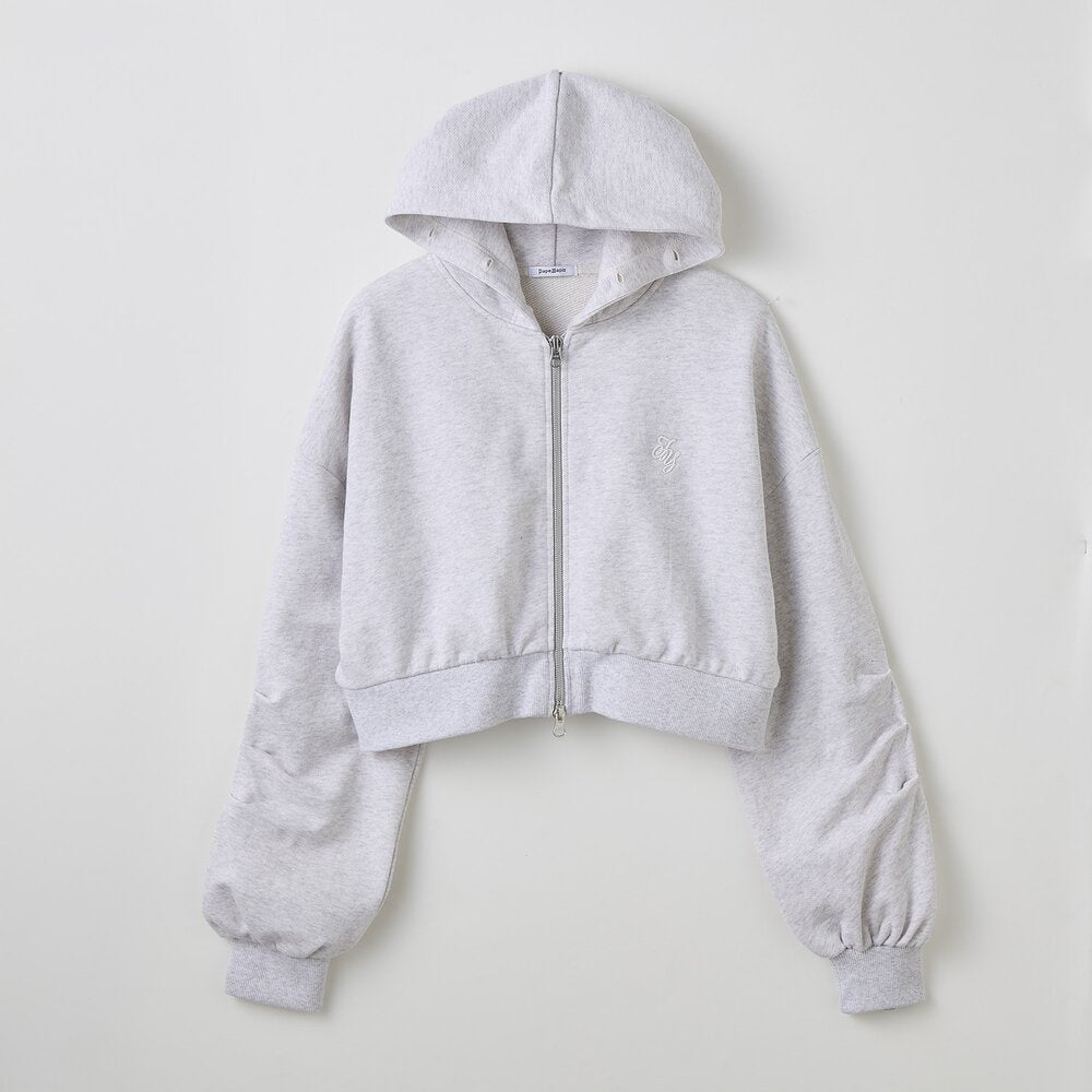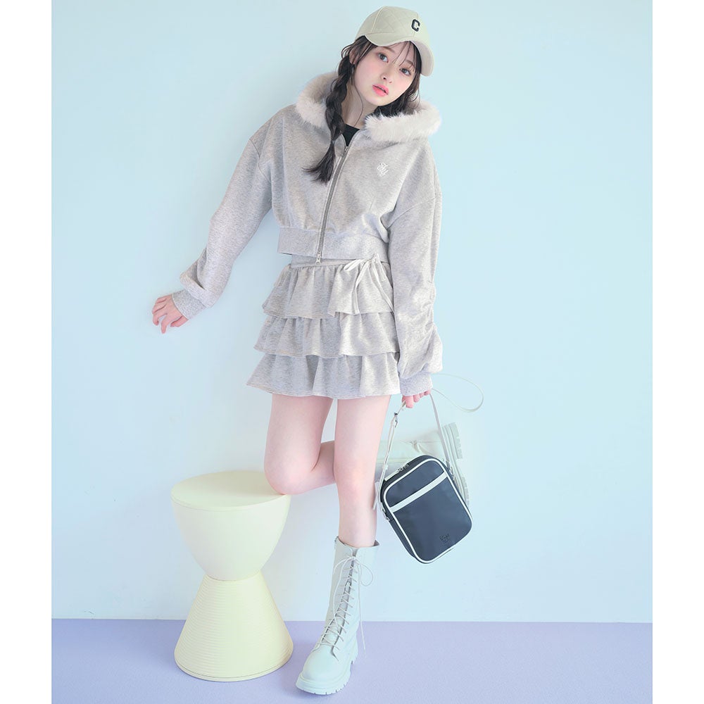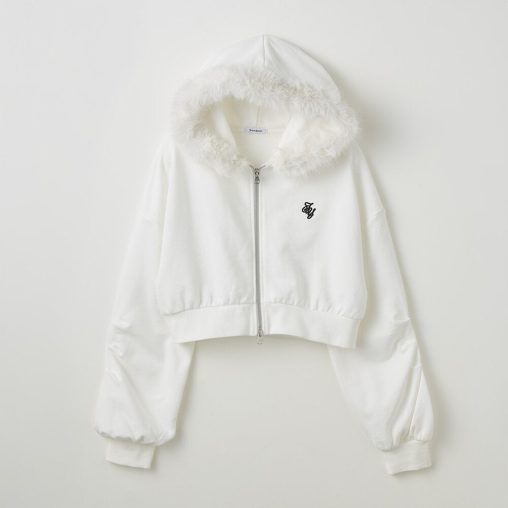 【高比良由菜・ゆなちゃんコラボ】取り外しフェイクファー付き袖タックコットンスウェットショート丈ジップパーカ【セットアップ可】