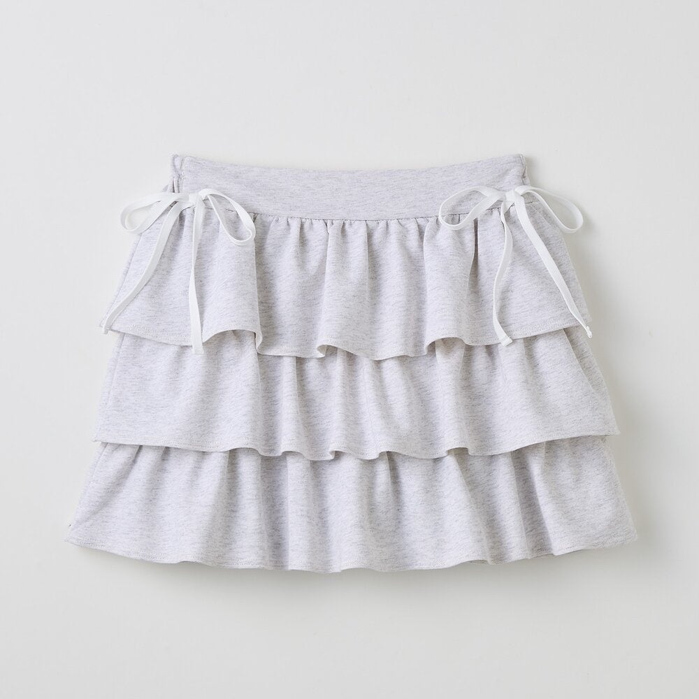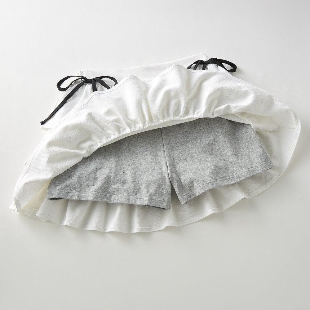 ふんわりと広がるティアードスカートにサイドリボンをデザインしました。スウェット生地でカジュアルに仕上げているため、ガーリーテイストに初めて挑戦する方も取り入れやすいアイテムです。インナーパンツ付きで安心感があり、ウエストはボタンホール付きゴムでサイズ調整が可能です。