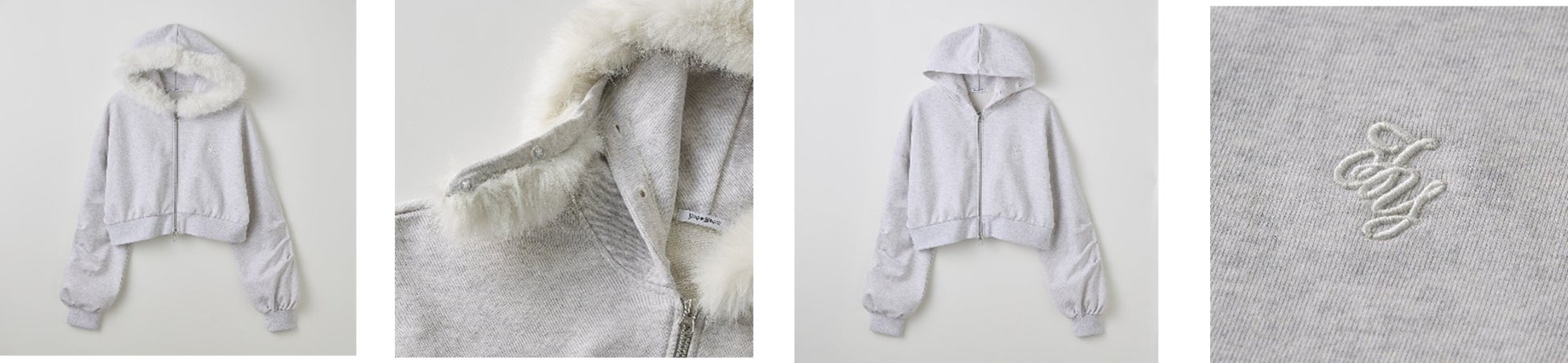 ふわふわフェイクファーがポイントの2WAYパーカは、脚長効果も期待できる少し短めのデザインで、パンツやスカートとのセットアップもバランスがよい丈感です。ボリューム感のあるタックスリーブがポイントで、フェイクファーは取り外しが可能なため、季節を問わず活躍します。胸元には今回のコラボレーション限定で高比良さんのイニシャル「T. Y」を刺繍しました。