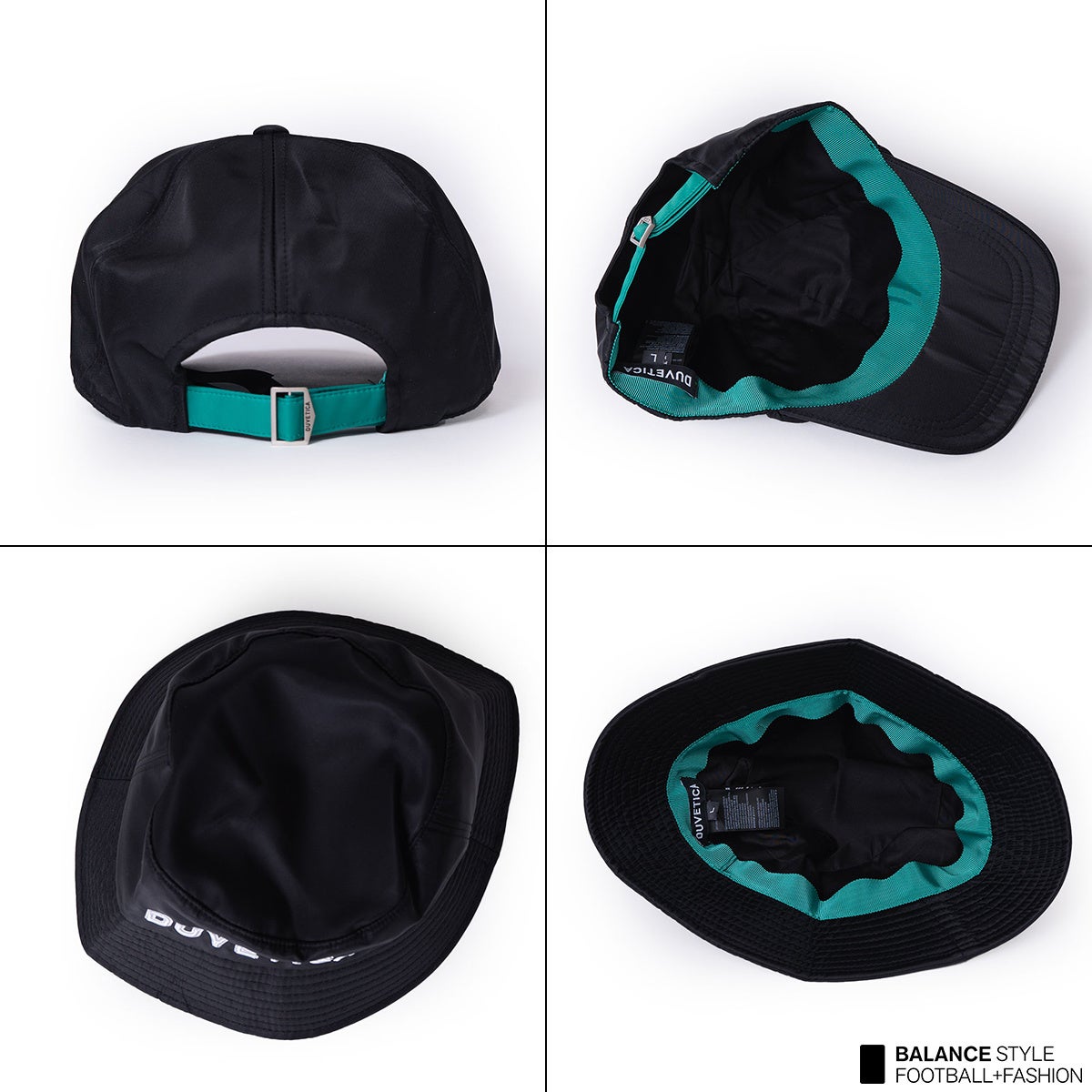 そして、もう一つの注目ポイントは裏地に使用されている差し色。グリーンに近いブルーで、エメラルドグリーンのような差し色が、両アイテムに入っています。キャップにはスナップとスベリの部分に、ハットにはスベリ部分に、鮮やかなエメラルドグリーンの生地が縫われており、ブラック調に差し色で春夏っぽさを表現。