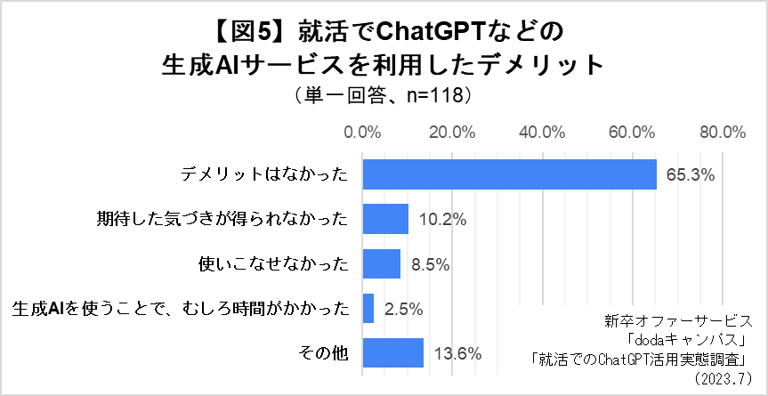 一方で利用のデメリットについては、65.3%の学生が「なかった」と回答。利用の効果の有無にかかわらず、デメリットはなかったと感じた学生が多い結果になりました。2位「期待した気づきが得られなかった」(10.2%)、3位「使いこなせなかった」(8.5%)でした。