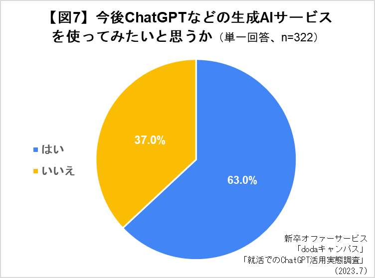 就活に利用していない学生に今後「ChatGPT」を利用したいかを聞いたところ、63%の学生が「はい」と回答、「いいえ」(37%)より27pt多い結果になりました。※7/26一部修正