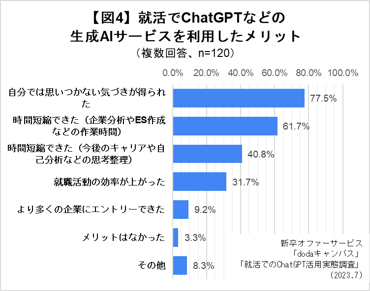 「ChatGPT」を利用した学生が感じたメリットの1位は「自分では思いつかない気づきが得られた」(77.5%)でした。2位は「時間短縮できた(企業分析やES作成などの作業時間)」(61.7%)、3位「時間短縮できた(今後のキャリアや自己分析などの思考整理)」(40.8%)となり、利用の理由に対して一定の期待した効果が得られた学生が多い結果になりました。