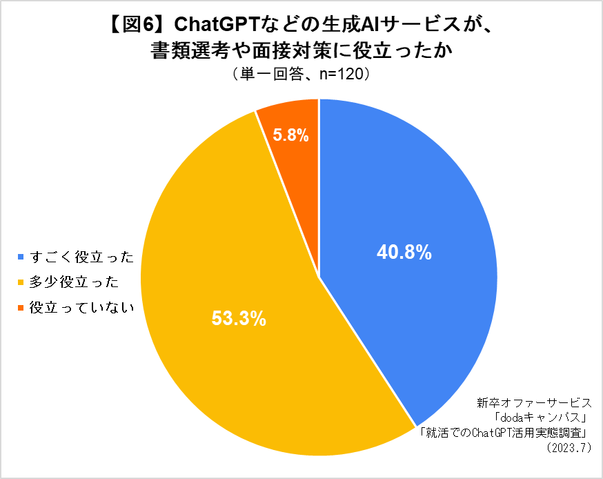 書類選考や面接対策などの就活において役立ったかについては、1位「多少役立った」(53.3%)、2位「すごく役立った」(40.8%)となり、「役立っていない」と回答した学生は全体の5.8%でした。「ChatGPT」の利用が、自身の就活に何らかの形で役立ったと感じた学生が多いことがわかりました。