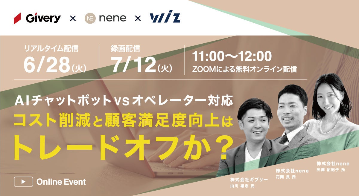 そこで本ウェビナーでは、1,000社以上にチャットボットを提供してきた株式会社ギブリーと、有人チャットのオペレーターを100人以上ネットワークし、月間約45,000件のチャット対応を請け負う株式会社neneが、「問い合わせ対応において最適なソリューションとは何か」をテーマにお話しします。両社の様々な事例から、どのような業態、規模、ケースでチャットボット(自動化)や有人によるチャット対応が有効なのかをディスカッション。双方の観点から、導入メリット・デメリットのほか具体的な費用対効果まで踏み込みます。