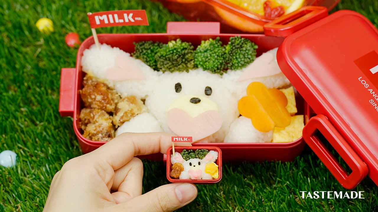 今回はMILKFED.で大人気、ライフスタイルグッズのランチボックスを使用し、うさぎのキャラ弁を実物大とミニチュアサイズで調理した動画を配信。