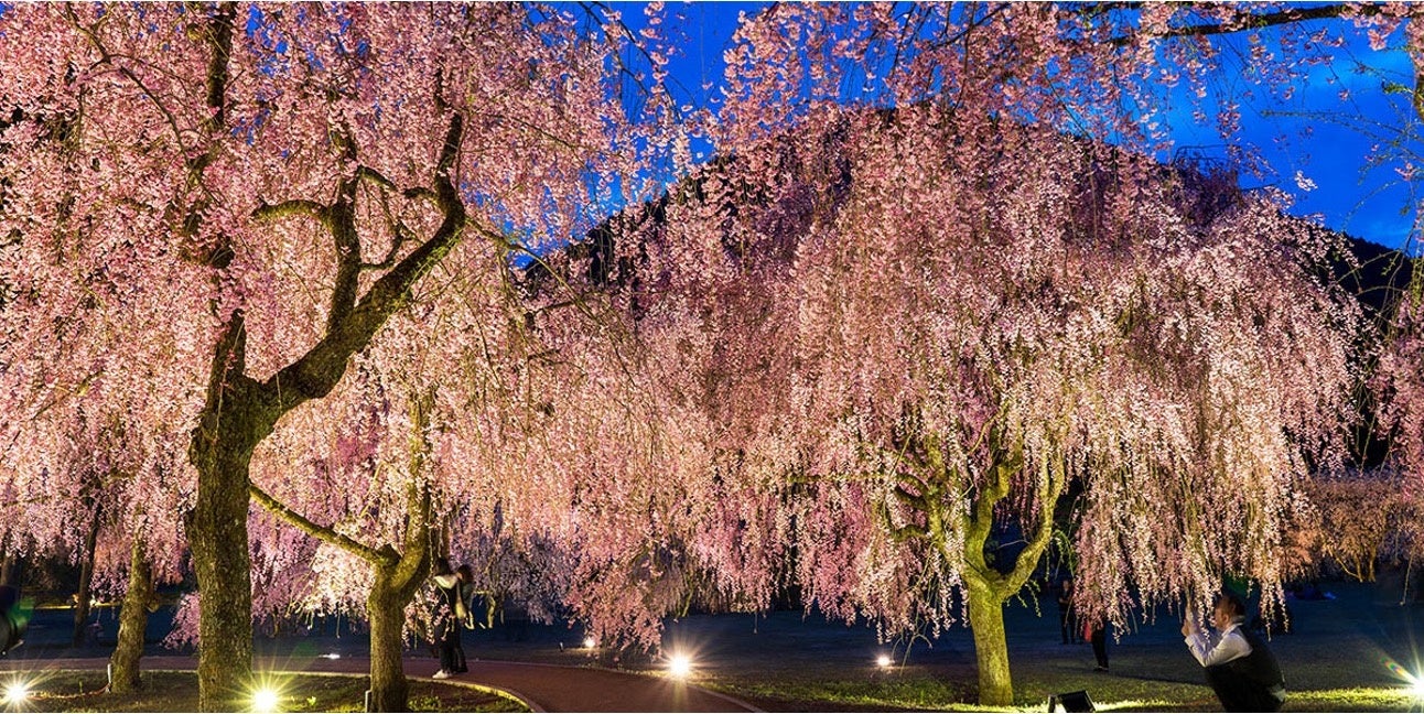 濃いピンクの花が垂れ下がった枝に満開になると、桜のトンネルを思わせる圧巻の春景色が広がります。