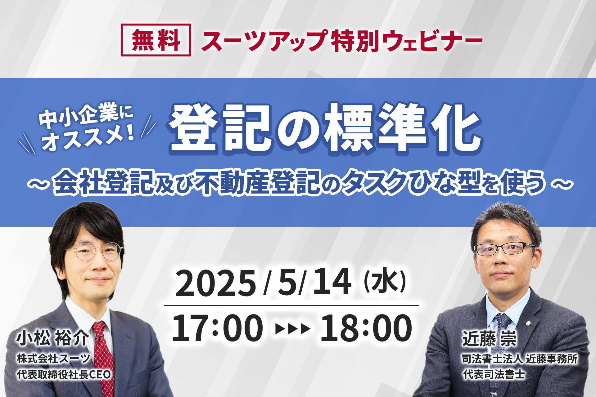 株式会社スーツ(所在地:東京都千代田区、代表取締役社長CEO:小松 裕介)は、2025年5月14日(水)17時から、ゲスト講師に、司法書士法人近藤事務所 代表司法書士 近藤 崇氏を迎え、第8回となるスーツアップ特別ウェビナー「中小企業にオススメ!登記の標準化 ~ 会社登記及び不動産登記のタスクひな型を使う ~」を無料開催します。