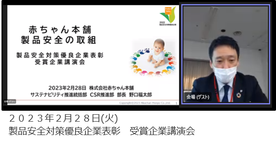 経済産業省が主催するPSアワード2022 受賞企業のうちの4社が講演会に登壇し、各社の取り組み事例の紹介などを行いました。赤ちゃん本舗は、大企業 小売販売事業者部門「技術総括・保安審議官賞」受賞企業として、広く多くの方に製品安全について知っていただける機会と捉え、その応募の経緯や取り組み事例について紹介いたしました。