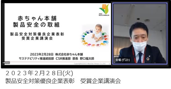 株式会社赤ちゃん本舗(本社:大阪市中央区 https://www.akachan.jp)は、経済産業省が主催する「令和4年度製品安全対策優良企業表彰(PSアワード2022)」において、大企業小売販売事業者部門 「技術総括・保安審議官賞」を受賞いたしました。ベビー専門店では赤ちゃん本舗が初の受賞となります。この度、2023年2月28日(火)「令和4年度 製品安全対策優良企業表彰 受賞企業講演会」に登壇しましたことをお知らせいたします。