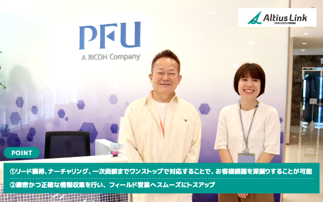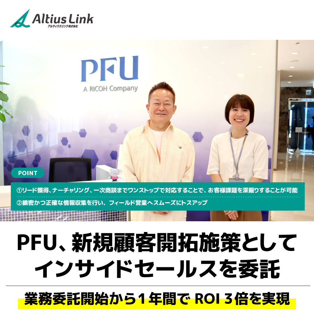 アルティウスリンク株式会社(所在地:東京都渋谷区、代表取締役社長:網野 孝、以下 アルティウスリンク)は、世界シェアNo.1※1のスキャナー/AI-OCRなど、多岐にわたるソリューション&サービスを提供するグローバル企業、株式会社PFU(本社:石川県かほく市 代表取締役社長:村上 清治 以下PFU)が提供するAI-OCR製品「DynaEye 11」の新規顧客獲得業務のインサイドセールスを受託し、受託開始から1年でROI3倍※2を実現しました。