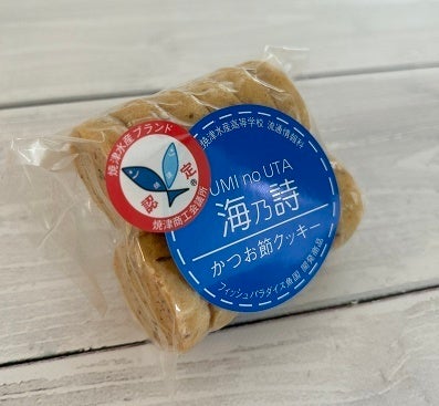 静岡県立焼津水産高校 流通情報課の生徒が考案したメニューを商品化したクッキーです。焼津産のかつお節チップとパルメザンチーズがたっぷり入ったクッキーで、甘塩っぱい味にどこか懐かしさが感じられます。焼津で作られた再仕込み醤油と駿河湾海洋深層水の塩を調味料に使って、噛むほどに旨味が口いっぱいに広がります。おやつはもちろん、お酒のお供にもおすすめです。