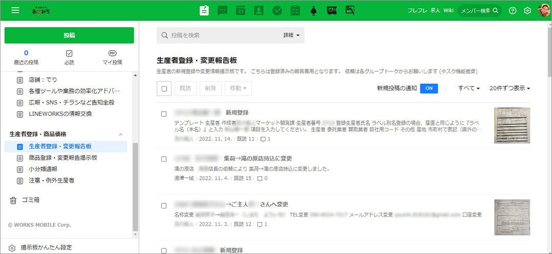 - 生産者に関する情報管理を「LINE WORKS」の掲示板とノート機能で共有