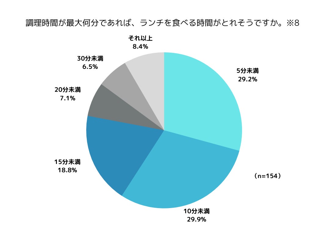 さらに、育児中にランチを食べる時間がないママたちに、「調理時間が何分であればランチの時間がとれるか」を聞いたところ、「5分未満(20.8%)」、「10分未満(29.9%)」、「15分未満(18.8%)」に 回答が多く集まりました。(※8)