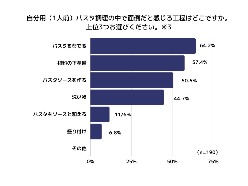 複数人前に比べて、1人前パスタ調理を面倒だと感じる理由として最も多かったのが、「麺を茹でる(64.2%)」工程でした。次いで、「材料の下準備(57.4%)」、「パスタソースを作る(50.4%)」、「洗い物(44.7%)」などの意見も多く挙がりました。(※3)